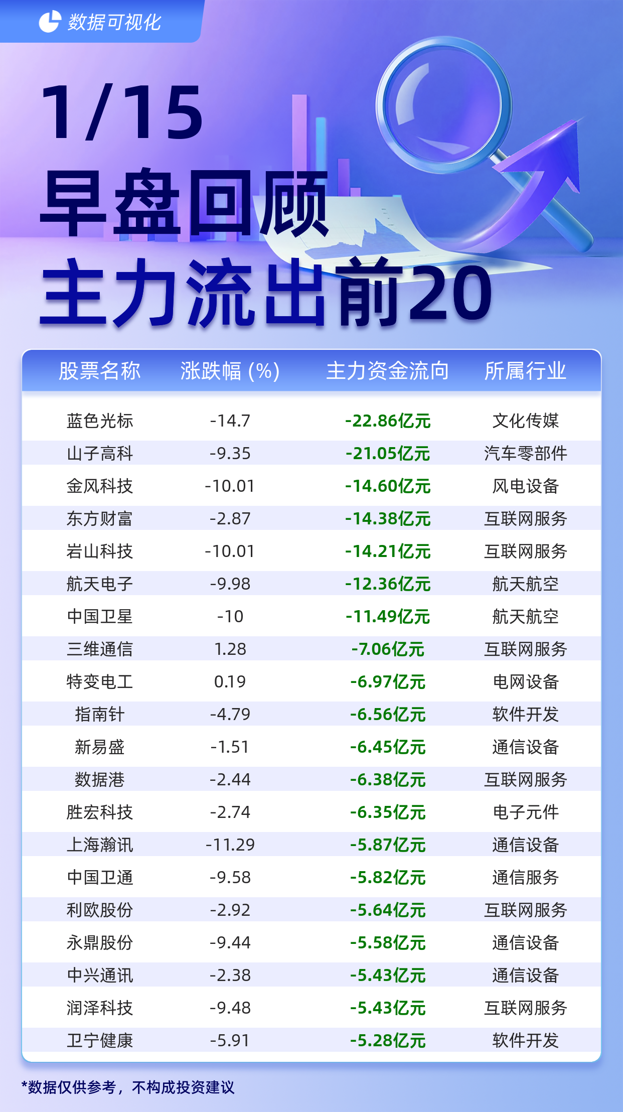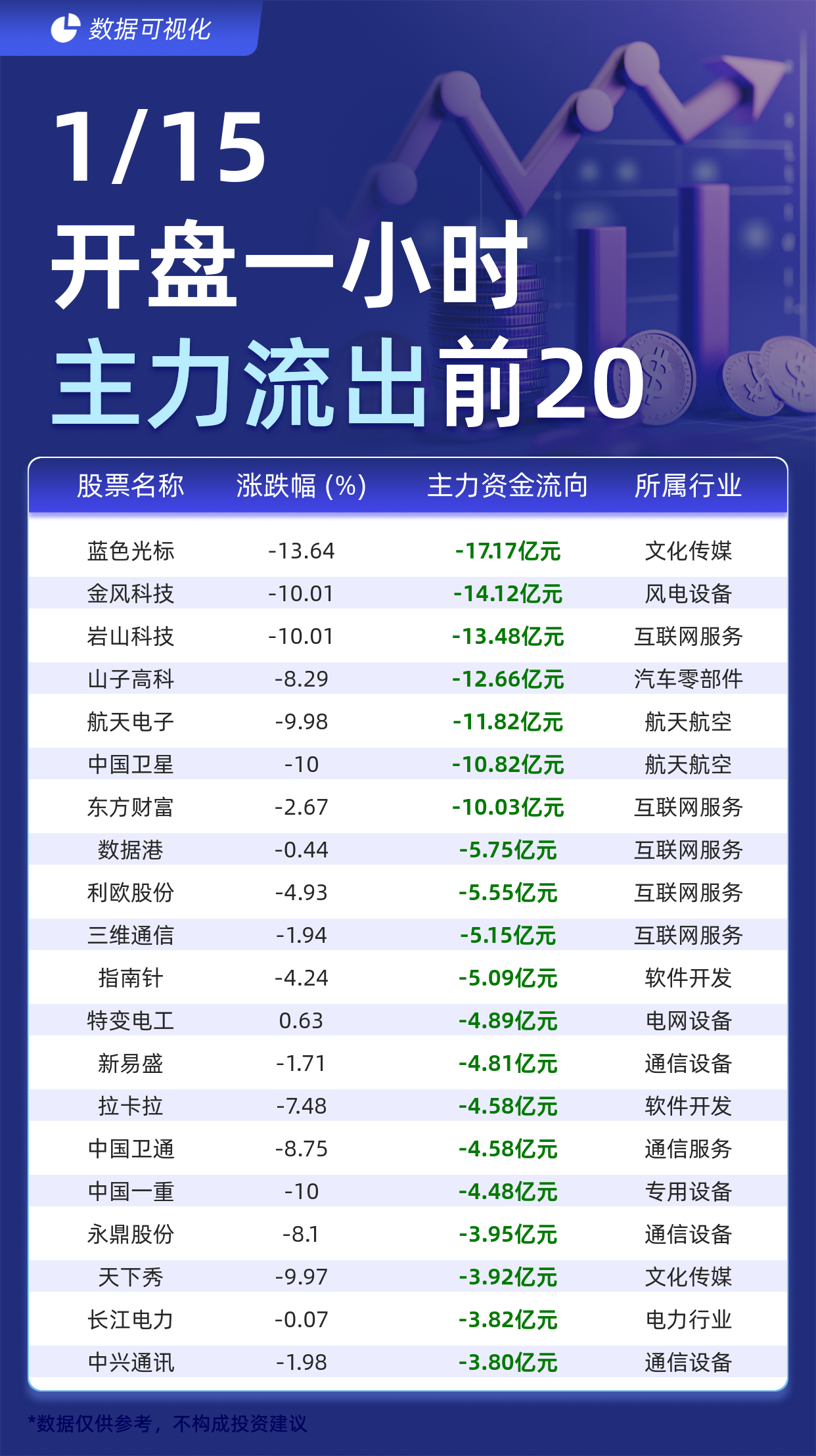 据交易所数据显示,截至1月15日开盘一小时,主力资金流出前20的股票分别为: 蓝色光标(-17.17亿元)、 金风科技(-14.12亿元)、 岩山科技(-13.48亿 元)、 山子高科(-12.66亿元)、 航天电子(-11.82亿元)、 中国卫星(-10.82亿元)、 东方财富(-10.03亿元)、 数据港(-5.75亿元)、 利欧股份(-5.55 亿元)、 三维通信(-5.15亿元)、 指南针(-5.09亿元)、 特变电工(-4.89亿元)、 新易盛(-4.81亿元)、 拉卡拉(-4.58亿元)、 中国卫通(-4.58亿 元)、 中国一重(-4.48亿元)、 永鼎股份(-3.95亿元)、 天下秀(-3.92亿元)、 长江电力(-3.82亿元)、 中兴通讯(-3.80亿元)。 | 股票名称 | 涨跌幅 (%) | 主力资金流向 | 所属行 | | --- | --- | --- | --- | | 蓝色光标 | -13.64 | -17.17亿元 | 文化传妙 | | 金风科技 | -10.01 | -14.12亿元 | 风电设备 | | 岩山科技 | -10.01 | -13.48亿元 | 互联网服 | ...