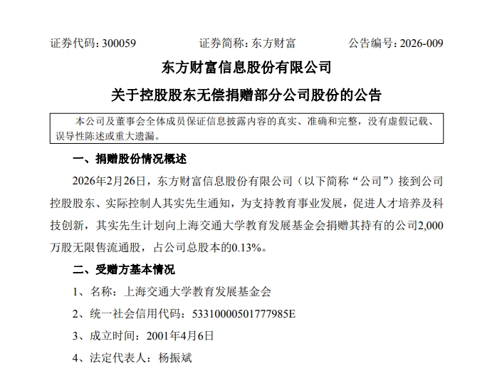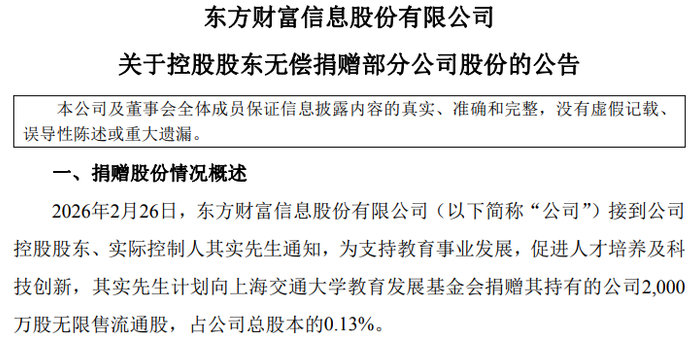 2月26日盘后,东方财富信息股份有限公司(东方财富,300059.SH)发布公告称,公司接到控股股东、实际控制人其实先生通知,为支持教育事业发展, 促进人才培养及科技创新,其实先生计划向上海交通大学教育发展基金会捐赠其持有的公司2000万股无限售流通股,占公司总股本的0.13%。 根据公告,目前其实持有东方财富约30.62亿股,占总股本的19.38%,此次捐赠后,其实的持股比例将降至19.25%。 2月26日收盘,东方财富股价收报22.50元/股,若以此计算,其实此番捐赠股票市值将达4.5亿元。 东方财富在公告中表示,本次捐赠事项不会导致公司控股股东发生变化,不会对公司治理结构及持续经营产生重大影响。 来源:东方财富 南都·湾财社记者注意到,A股市场上,向高校捐赠股票等行为并不罕见。2025年5月,宁德时代就曾公告称,股东及副董事长李平先生为支持教育事业发 展,与其配偶拟向基金会无偿捐赠405万股宁德时代无限售流通股股票,用于设立"复旦大学学敏自然科学研究基金"。根据公开资料,李平为复旦大学学 士,曾于1985年进入复旦大学材料系高分子专业学习。 2025年12月,豪威集团也发布公告称,虞仁荣拟向宁波东方理工 ...