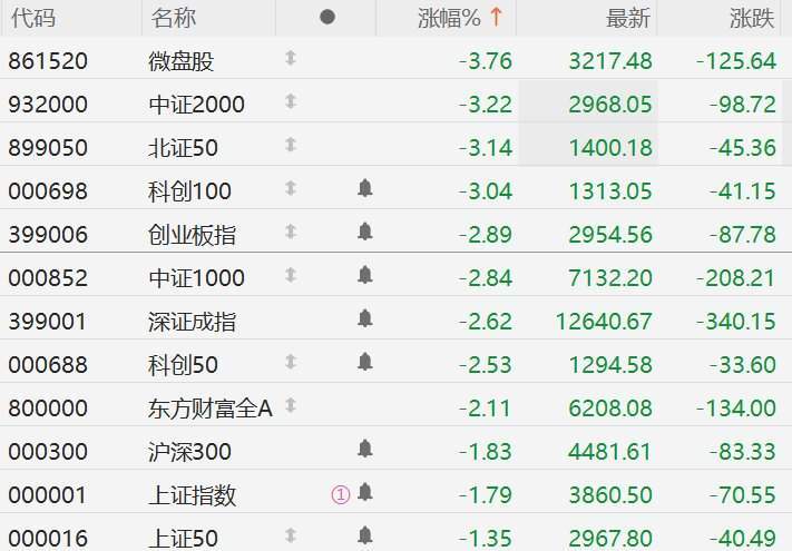 | 代码 | 名称 | | | 涨幅% ↑ | 最新 | 消费 | | --- | --- | --- | --- | --- | --- | --- | | 861520 | 微盘股 | 1 | | -3.76 | 3217.48 | -125.64 | | 932000 | 中证2000 | 3 | | -3.22 | 2968.05 | -98.72 | | 899050 | 北证50 | 1 | | -3.14 | 1400.18 | -45.36 | | 000698 | 科创100 | 1 | 喜 | -3.04 | 1313.05 | -41.15 | | 399006 | 创业板指 | 年 | 章 | -2.89 | 2954.56 | -87.78 | | 000852 | 中证1000 | 1 | 血 | -2.84 | 7132.20 | -208.21 | | 399001 | 深证成指 | | 育 | -2.62 | 12640.67 | -340.15 | | 000688 | 科创50 | 1 | 10 | -2.53 | 1294.58 | -33.60 | | 800000 ...