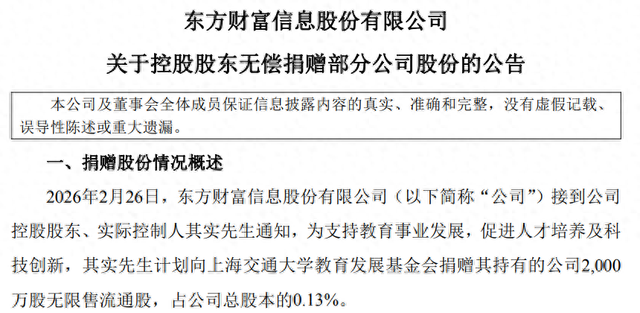 2月26日,东方财富信息股份有限公司(以下简称"东方财富")发布公告称,接到公司控股股东、实际 控制人其实通知,为支持教育事业发展,促进人才培养及科技创新,其实计划向上海交通大学教育发展 基金会捐赠其持有的公司2000万股无限售流通股,占公司总股本的0.13%。 公开信息显示:其实,原名沈军,1993年本科毕业于上海交大,2005年创办东方财富网。2022年10月, 其实被聘为上海交大校董。 另上海交通大学医学院官方微信消息,2026年1月20日,其实捐建的上海交通大学医学院图书馆,举行 了其实图书馆的铭牌揭牌仪式,上海交通大学医学院院长、中国工程院院士范先群和其实为图书馆铭牌 揭幕。 | 捐赠主体 | 计划捐赠股份 | 计划捐赠股份数 | 捐赠方式 | 股份来源 | | --- | --- | --- | --- | --- | | | 数量(股) | 量占总股本比例 | | | | 其实 | 20,000,000 | 0.13% | 非交易过户 | 首次公开发行前已 | | | | | (捐赠) | 发行的公司股份 | | 股东名称 | 捐赠前 | | 捐赠后 | | | --- | --- | --- ...