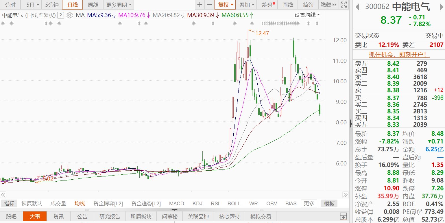 A股异动丨中能电气跌近8%,终止重大资产重组