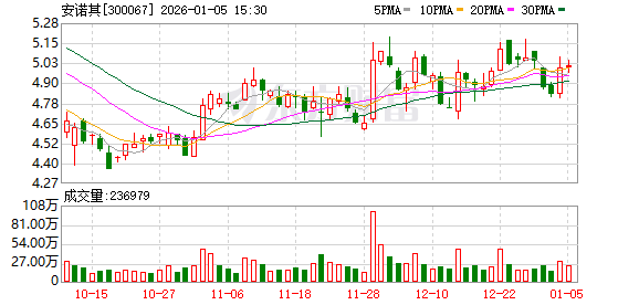 12月31日,安诺其盘中上涨2.07%,截至14:04,报4.93元/股,成交7519.42万元,换手率1.65%,总市值 56.91亿元。 资金流向方面,主力资金净流出290.57万元,特大单买入217.93万元,占比2.90%,卖出434.63万元,占 比5.78%;大单买入1812.09万元,占比24.10%,卖出1885.96万元,占比25.08%。 安诺其今年以来股价跌19.97%,近5个交易日跌2.38%,近20日跌1.60%,近60日涨6.71%。 安诺其所属申万行业为:基础化工-化学制品-纺织化学制品。所属概念板块包括:染料涂料、OLED、 海工装备、芯片概念、航天军工等。 截至12月19日,安诺其股东户数4.69万,较上期减少3.26%;人均流通股19984股,较上期增加3.37%。 2025年1月-9月,安诺其实现营业收入7.73亿元,同比增长3.78%;归母净利润-3694.24万元,同比减少 400.98%。 分红方面,安诺其A股上市后累计派现3.45亿元。近三年,累计派现5771.87万元。 机构持仓方面,截止2025年9月30日,安诺其十大流通股东中,香港中央结算有限公司位居第七大 ...