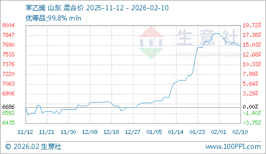 02月10日苯乙烯7678.00元/吨 30天上涨12.09%