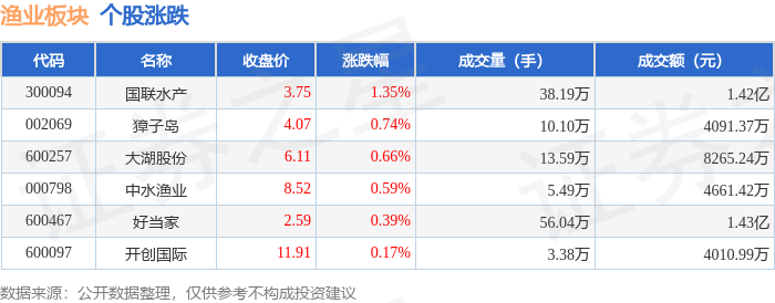 证券之星消息,11月13日渔业板块较上一交易日上涨0.68%,国联水产领涨。当日上证指数报收于 4029.5,上涨0.73%。深证成指报收于13476.52,上涨1.78%。渔业板块个股涨跌见下表: 从资金流向上来看,当日渔业板块主力资金净流出3366.3万元,游资资金净流出1090.11万元,散户资金 净流入4456.41万元。渔业板块个股资金流向见下表: | 代码 | 名称 | 收盘价 | 涨跌幅 | 成交量(手) | 成交额(元) | | --- | --- | --- | --- | --- | --- | | 300094 | 国联水产 | 3.75 | 1.35% | 38.19万 | 1.42 乙 | | 002069 | 獐子岛 | 4.07 | 0.74% | 10.10万 | 4091.37万 | | 600257 | 大湖股份 | 6.11 | 0.66% | 13.59万 | 8265.24万 | | 000798 | 中水渔业 | 8.52 | 0.59% | 5.49万 | 4661.42万 | | 600467 | 好当家 | 2.59 | 0.39% | 56.04万 | 1. ...