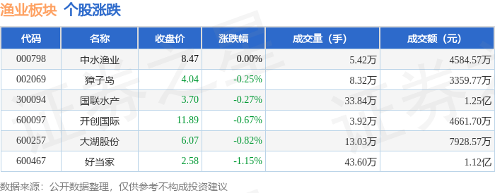证券之星消息,11月12日渔业板块较上一交易日下跌0.53%,好当家领跌。当日上证指数报收于 4000.14,下跌0.07%。深证成指报收于13240.62,下跌0.36%。渔业板块个股涨跌见下表: | 代码 | 名称 | 收盘价 | 涨跌幅 | 成交量(手) | 成交额(元) | | --- | --- | --- | --- | --- | --- | | 000798 | 中水渔业 | 8.47 | 0.00% | 5.42万 | 4584.57万 | | 002069 | 獐子岛 | 4.04 | -0.25% | 8.32万 | 3359.77万 | | 300094 | 国联水产 | 3.70 | -0.27% | 33.84万 | 1.25 亿 | | 600097 | 开创国际 | 68'IT | -0.67% | 3.92万 | 4661.70万 | | 600257 | 大湖股份 | 6.07 | -0.82% | 13.03万 | 7928.57万 | | 600467 | 好当家 | 2.58 | -1.15% | 43.60万 | 1.12亿 | 从资金流向上来看,当日渔业板块主力资 ...