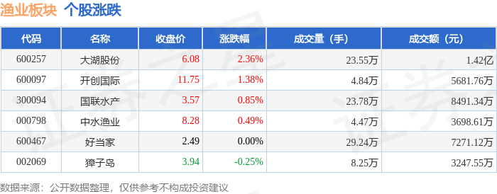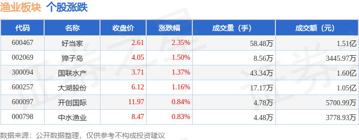 从资金流向上来看,当日渔业板块主力资金净流出1129.64万元,游资资金净流出1563.98万元,散户资金 净流入2693.62万元。渔业板块个股资金流向见下表: | 代码 | 名称 | 主力净流入 (元) | 主力净占比 游资净流入 (元) | | 游资净占比 散户净流入 (元) | | 散户净占比 | | --- | --- | --- | --- | --- | --- | --- | --- | | 600467 | 好当家 | 603.88万 | 3.99% | -752.93万 | -4.98% | 149.04万 | 0.99% | | 002069 | 獐子岛 | -35.04万 | -1.02% | -289.69万 | -8.41% | 324.73万 | 9.42% | | 600097 | 开创国际 | -65.27万 | -1.14% | -562.95万 | -9.87% | 628.22万 | 11.02% | | 000798 中水渔业 | | -312.77万 | -8.28% | -161.96万 | -4.29% | 474.72万 | 12.56% | | 300094 ...