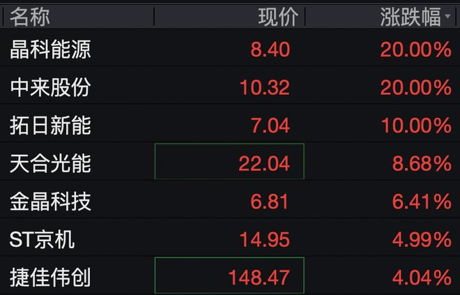 编辑 | 钉钉 | 名称 | 现价 | 涨跌幅 - | | --- | --- | --- | | 晶科能源 | 8.40 | 20.00% | | 中来股份 | 10.32 | 20.00% | | 拓日新能 | 7.04 | 10.00% | | 天合光能 | 22.04 | 8.68% | | 金晶科技 | 6.81 | 6.41% | | ST京机 | 14.95 | 4.99% | | 捷佳伟创 | 148.47 | 4.04% | 消息面上,据多家媒体报道,近期马斯克旗下的SPACE X团队和Tesla团队"摸底"中国光伏企业,其中TESLA团队目前仅是验 厂阶段,到访多家产业链企业;SPACE X团队主要到访光伏设备厂,并与国内某头部异质结设备厂有订单合作,但基于商业保 密要求等因素,未作公开。 2月4日午后,太空光伏板块走强,晶科能源、中来股份20%涨停,拓日新能涨停,天合光能涨超8%,乾照光电涨近4%,通 威股份涨超3%。 ...