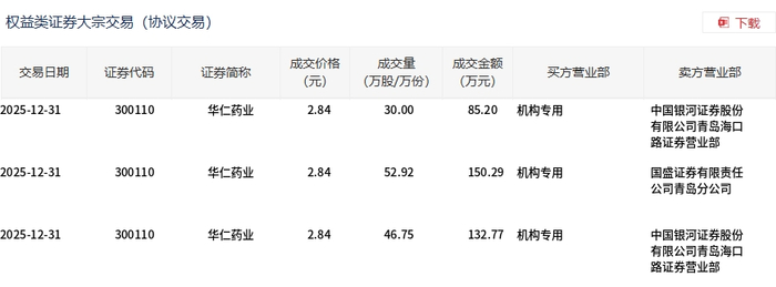 12月31日,华仁药业大宗交易成交129.67万股,成交额368.26万元,占当日总成交额的7.08%,成交价 2.84元,较市场收盘价3.15元折价9.84%。 | 交易日期 | 证券代码 | 证券简称 | 成交价格 | 成交量 | 成交全额 | 买方营业部 | 卖方营业部 | | --- | --- | --- | --- | --- | --- | --- | --- | | | | | (元) | (万股/万份) | (万元) | | | | 2025-12-31 | 300110 | 华仁药业 | 2.84 | 30.00 | 85.20 机构专用 | | 中国银河证券股份 | | | | | | | | | 有限公司青岛海口 | | | | | | | | | 跟所有量不知 | | 2025-12-31 | 300110 | 华信药业 | 2.84 | 52.92 | 150.29 机构专用 | | 国盛证券有限责任 | | | | | | | | | 公司青岛分公司 | | 2025-12-31 | 300110 | 华仁药业 | 2.84 | 46.75 | 132.77 机构专用 | | 中 ...