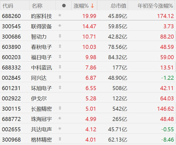 | 代码 | 名称 | | 涨幅% ↓ | 总市值 | 年初至今涨幅% | | --- | --- | --- | --- | --- | --- | | 688260 | 昀冢科技 | -0. | 19.99 | 45.89亿 | 174.12 | | 300545 | 联得装备 | * | 14.47 | 59.85 亿 | 3.73 | | 300686 | 智动力 | + | 10.71 | 42.82 7 | 88.20 | | 603890 | 春秋电子 | 1 | 10.03 | 78.56亿 | 48.59 | | 600203 | 福目电子 | 1 | 9.98 | 84.32亿 | 59.00 | | 688332 | 中科蓝讯 | 1 | 7.86 | 177亿 | 13.51 | | 002845 | 同兴达 | 1 | 6.87 | 48.90亿 | -1.22 | | 601231 | 环旭电子 | 1 | 6.55 | 508亿 | 42.11 | | 002922 | 伊戈尔 | | 5.28 | 122亿 | 64.03 | | 300115 | 长盈精密 | 1 = | 5 ...