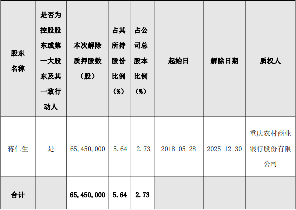 中国经济网北京1月6日讯 智飞生物(300122.SZ)昨日晚间发布关于公司控股股东部分股份解除质押 的公告。公司近日接到公司控股股东、实际控制人蒋仁生的通知,获悉蒋仁生所持有公司的部分股份解 除质押。 | 股东名称 | | | 累计被质押股份 | 合计占其所 | 合计占公 | | --- | --- | --- | --- | --- | --- | | | 持股数量(股) | 持股比例(%) | 数量(股) | 持股份比例 (%) | 司总股本 比例(%) | | 蒋仁生 | 1, 159, 573, 500 | 48. 44 | 119, 250, 000 | 10. 28 | 4.98 | | 蒋凌峰 | 129.600.000 | 5.41 | 0 | 0 | 0 | | 蒋喜生 | 16. 800. 000 | 0. 70 | 0 | 0 | 0 | | 合计 | 1, 305, 973, 500 | 54. 56 | 119, 250, 000 | 9. 13 | 4. 98 | (责任编辑:田云绯) 蒋仁生本次解除质押股数为65,450,000股,占其所持股份比例5.64%,占公司总股本比例2 ...