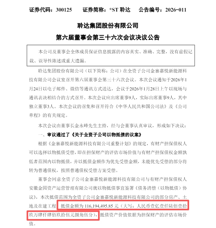 *ST聆达:全资子公司金寨嘉悦新能源科技以物抵债1.16亿元