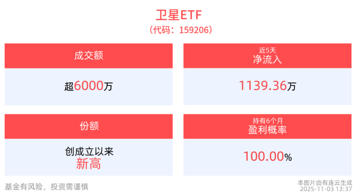 截至13:38,卫星ETF(159206)上涨0.93%,盘中净申购1100万元。成分股航天智装涨停,中国卫 星,国光电气等个股跟涨。 | 分时 多日 1分 5分 15分 30分 60分 日 * | F9 盛前盤后 叠加 九转 画线 工具 <> 2 >> | | | | | | 卫星ETF | | | --- | --- | --- | --- | --- | --- | --- | --- | --- | | | 159206[卫星ETF] 13:38 价 1.193 涨跌 0.011(0.93%) 均价 1.179 成交量 808 IOPV 1.1919 2... 1.18% | | | 1.193 +0.011 +0.93% | | | ж 159206 | | | | | | | SZSE CNY 13:38:39 交易中 | | | 04 7 8 8 8 | | | 1.193 | | 0.89% | | 净值理势 永赢国证商用卫星通 | | 今年 | 0.00% 120日 26.91% | | | | | | | 48,76% 零壳 | 151885 | | 0.08% 250日 0.00% | ...