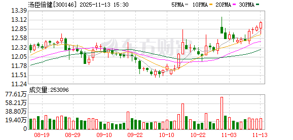 截至9月30日,汤臣倍健股东户数7.11万,较上期减少0.14%;人均流通股15762股,较上期减少0.67%。 2025年1月-9月,汤臣倍健实现营业收入49.15亿元,同比减少14.27%;归母净利润9.07亿元,同比增长 4.45%。 分红方面,汤臣倍健A股上市后累计派现83.21亿元。近三年,累计派现24.29亿元。 机构持仓方面,截止2025年9月30日,汤臣倍健十大流通股东中,易方达创业板ETF(159915)位居第 二大流通股东,持股2085.08万股,相比上期减少374.64万股。香港中央结算有限公司位居第五大流通股 东,持股1508.61万股,相比上期增加271.19万股。南方中证500ETF(510500)位居第七大流通股东, 持股1484.94万股,相比上期减少32.26万股。汇添富中证主要消费ETF(159928)位居第九大流通股 东,持股1289.40万股,为新进股东。 责任编辑:小浪快报 11月14日,汤臣倍健盘中下跌2.07%,截至14:24,报12.78元/股,成交2.64亿元,换手率1.82%,总市值 216.20亿元。 资金流向方面,主力资金净流出2135.93万元,特大单 ...