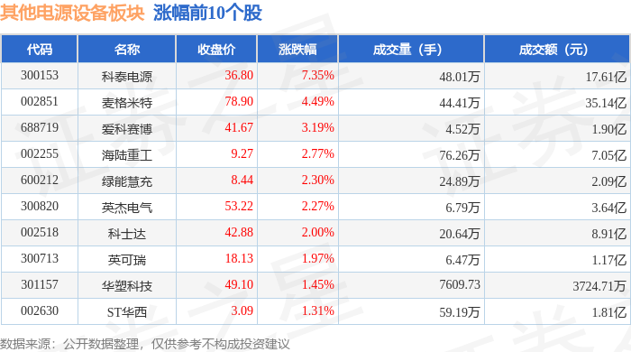 从资金流向上来看,当日其他电源设备板块主力资金净流出4.56亿元,游资资金净流出194.77万元,散户 资金净流入4.58亿元。其他电源设备板块个股资金流向见下表: 证券之星消息,10月28日其他电源设备板块较上一交易日下跌0.72%,海博思创领跌。当日上证指数报 收于3988.22,下跌0.22%。深证成指报收于13430.1,下跌0.44%。其他电源设备板块个股涨跌见下表: | 代码 | 名称 | 收盘价 | 涨跌幅 | 成交量(手) | 成交额(元) | | | --- | --- | --- | --- | --- | --- | --- | | 300153 | 科泰电源 | 36.80 | 7.35% | 48.01万 | | 17.61亿 | | 002851 | 麦格米特 | 78.90 | 4.49% | 44.41万 | | 35.14亿 | | 688719 | 爱科赛博 | 41.67 | 3.19% | 4.52万 | | 1.90亿 | | 002255 | 海陆重工 | 9.27 | 2.77% | 76.26万 | | 7.05亿 | | 600212 | 绿能慧充 | 8.4 ...