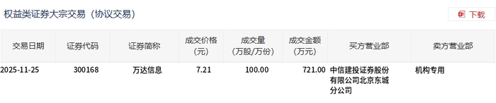 | 权益类证券大宗交易(协议交易) | | | | | | | | 6 下载 | | --- | --- | --- | --- | --- | --- | --- | --- | --- | | 交易日期 | 证券代码 | 证券简称 | 成交价格 (元) | 成交量 (万股/万份) | 成交金额 (万元) | 买方营业部 | 卖方营业部 | | | 2025-11-20 | 300168 | 万达信息 | 7.01 | 100.00 | | 701.00 中信建投证券股份 有限公司北京东城 分公司 | 机构专用 | | 11月20日,万达信息大宗交易成交100万股,成交额701万元,占当日总成交额的4.85%,成交价7.01 元,较市场收盘价7.05元折价0.57%。 ...