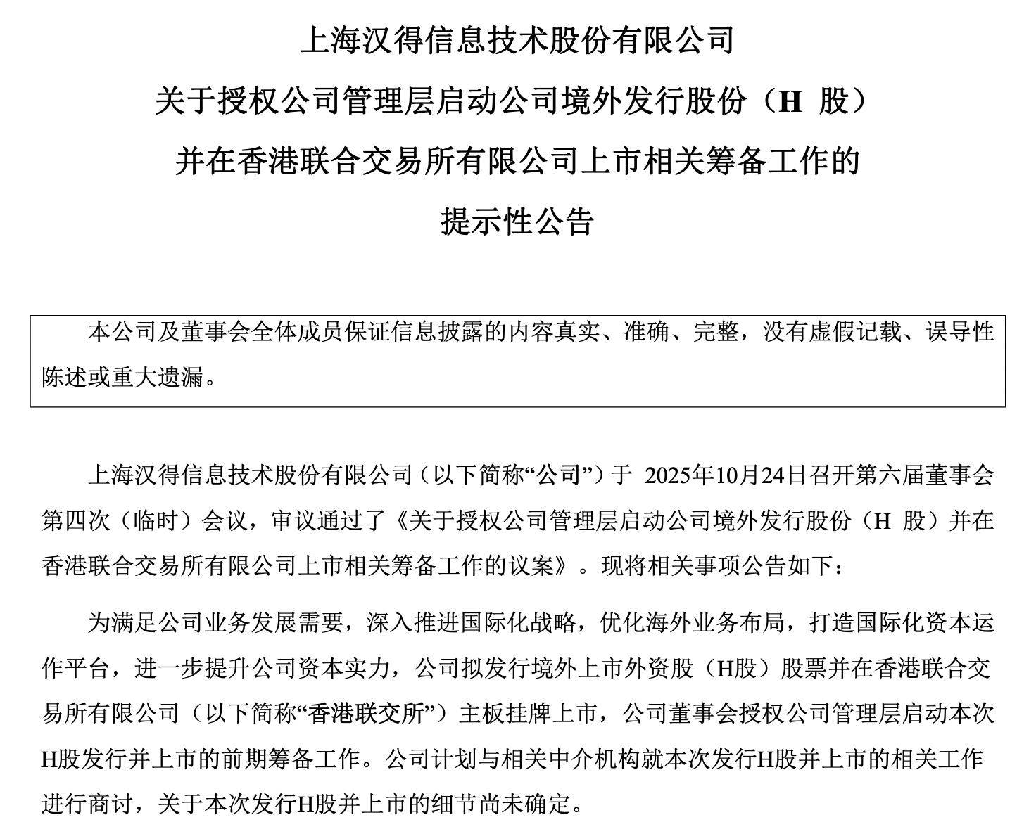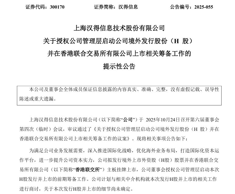 Group 1 - The core point of the article is that Hand Information (300170) plans to issue H-shares and list on the Hong Kong Stock Exchange to support its internationalization strategy and business development [1] - The company's board has authorized management to initiate the preparatory work for the H-share issuance and listing, with discussions planned with relevant intermediaries [1] Group 2 - Hand Information is a comprehensive service provider of digital and intelligent products and solutions, focusing on providing full-chain and full-scenario digital solutions for medium and large enterprises [3] - For the first three quarters of 2025, the company reported a revenue of 2.439 billion yuan, representing a year-on-year increase of 3.67% [3] - The net profit attributable to shareholders for the same period was 145 million yuan, showing a year-on-year growth of 6.96%, while the net profit after deducting non-recurring gains and losses was 136 million yuan, up 19.22% year-on-year [3] - The basic earnings per share for the company was 0.15 yuan [3]