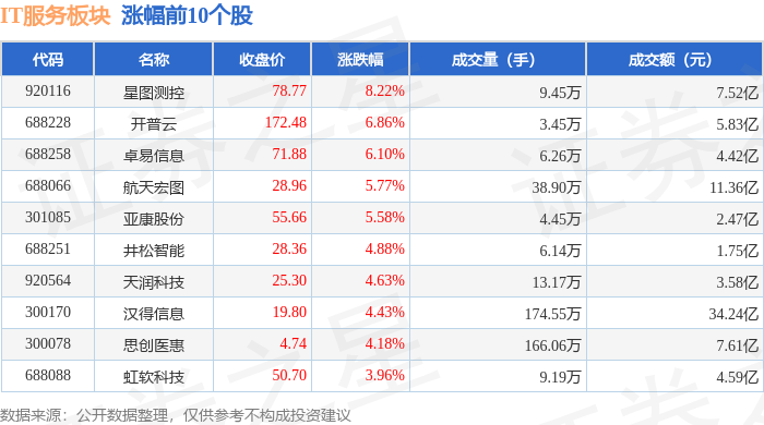 证券之星消息,12月1日IT服务板块较上一交易日上涨0.86%,星图测控领涨。当日上证指数报收于 3914.01,上涨0.65%。深证成指报收于13146.72,上涨1.25%。IT服务板块个股涨跌见下表: 从资金流向上来看,当日IT服务板块主力资金净流出5.91亿元,游资资金净流出8346.74万元,散户资金 净流入6.74亿元。IT服务板块个股资金流向见下表: | 代码 | 名称 | 主力净流入(元) | 主力净占比 游资净流入 (元) | | 游资净占比 散户净流入 (元) | | 散户净占比 | | --- | --- | --- | --- | --- | --- | --- | --- | | 300170 汉得信息 | | 4.57 Z | 13.36% | -1.30 Z | -3.80% | -3.27 Z | -9.55% | | 300496 中科创达 | | 1.73亿 | 8.68% | 286.59万 | 0.14% | -1.76 Z | -8.82% | | 000034 神州数码 | | 1.39 Z | 9.97% | -5722.78万 | -4.12% | -8131. ...