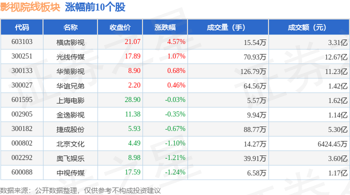 | 代码 | 名称 | 收盘价 | 涨跌幅 | 成交量(手) | 成交额(元) | | | --- | --- | --- | --- | --- | --- | --- | | 603103 | 横店影视 | 25.50 | 10.01% | 12.48万 | | 3.10亿 | | 300528 | 幸福蓝海 | 22.29 | 8.73% | 41.29万 | | 9.12亿 | | 300251 | 光线传媒 | 19.56 | 7.12% | 225.37万 | | 44.03亿 | | 002905 | 金逸影视 | 12.15 | 5.10% | - 39.73万 | | 4.84亿 | | 001330 | 博纳影V | 9.60 | 4.58% | 162.74万 | | 15.57亿 | | 600977 | 中国电影 | 17.79 | 3.37% | 114.30万 | | 20.20亿 | | 601595 | 上海电影 | 29.86 | 2.09% | 12.18万 | | 3.63亿 | | 002739 | 万达电影 | 11.84 | 1.81% | 116.50万 | | ...