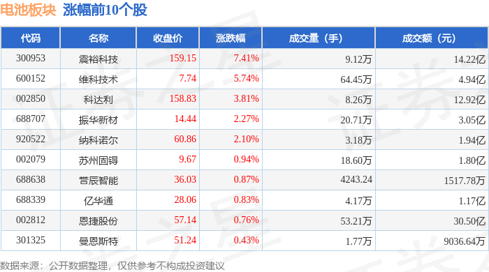 从资金流向上来看,当日电池板块主力资金净流出67.58亿元,游资资金净流入14.59亿元,散户资金净流 入52.99亿元。电池板块个股资金流向见下表: | 代码 | 名称 | 主力净流入 (元) | | 主力净占比 游资净流入 (元) | | 游资净占比 散户净流入 (元) | | 散户净占比 | | --- | --- | --- | --- | --- | --- | --- | --- | --- | | 002850 | 科达利 | | 1.53亿 | 11.83% | -7508.81万 | -5.81% | -7774.88万 | -6.02% | | 300953 震裕科技 | | | 1.07亿 | 7.52% | -7922.51万 | -5.57% | -2771.18万 | -1.95% | | 002805 丰元股份 | | | 5613.27万 | 4.66% | 1.11亿 | 9.19% | -1.67 Z | -13.85% | | 600152 维科技术 | | | 3102.47万 | 6.28% | 1209.11万 | 2.45% | -4311.58万 | -8.73 ...