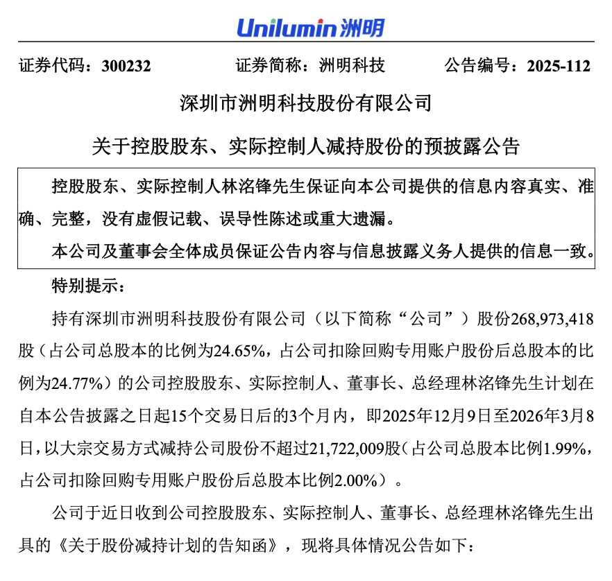 11月17日,洲明科技公告,持有公司股份268,973,418股(占公司总股本的比例为24.65%,占公司扣除回购专用账户股份后总股 本的比例为24.77%)的公司控股股东、实际控制人、董事长、总经理林洺锋计划在自本公告披露之日起15个交易日后的3个月 内,以大宗交易方式减持公司股份不超过21,722,009股(占公司总股本比例1.99%,占公司扣除回购专用账户股份后总股本比例 2.00%)。 本次拟减持的原因为个人资金需求,拟减持股份来源为公司非公开发行股票的股份及其因以资本公积转增股本方式取得的股 份。 林洺锋原计划在2025年7月29日至2025年10月28日,以大宗交易方式减持其首次公开发行前取得的股份、非公开发行股票的股 份、公开发行可转换公司债券的股份及因以资本公积转增股本方式取得的股份,预计减持公司股份合计不超过21,722,009股, 占公司总股本比例1.99%,占公司扣除回购专用账户股份后总股本比例2.00%。 资料显示,深圳市洲明科技股份有限公司的主营业务是LED显示、LED照明产品及光显解决方案。公司的主要产品是智慧显 示、智能照明、文创灯光、其他。 事实上,就在本次减持计划披露前不久, ...