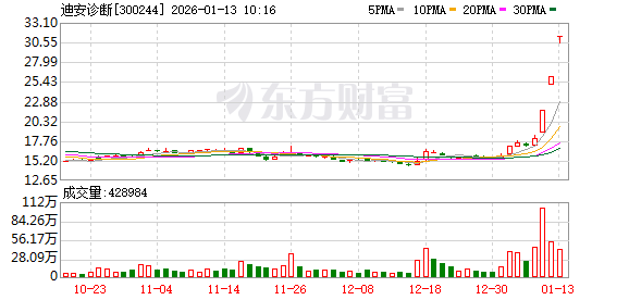 证券代码:300244 证券简称:迪安诊断 公告编号:2026-003 迪安诊断技术集团股份有限公司 股票交易异常波动公告 本公司及董事会全体成员保证信息披露的内容真实、准确、完整,没有虚假记 载、误导性陈述或重大遗漏。 一、股票交易异常波动的情况介绍 迪安诊断技术集团股份有限公司(以下简称"公司"或"迪安诊断")股票连 续三个交易日内(2026年1月8日、1月9日、1月12日)收盘价格涨幅偏离值累计达到 30%以上,根据《深圳证券交易所交易规则》的有关规定,属于股票交易异常波动情 形。 二、公司关注并核实相关情况 5. 公司控股股东、实际控制人、董事和高级管理人员在股票异常波动期间不存 在买卖公司股票的情形。 三、是否存在应披露而未披露信息的说明 公司董事会确认,公司目前没有任何根据《深圳证券交易所创业板股票上市规 则》等有关规定应予以披露而未披露的事项或与该事项有关的筹划、商谈、意向、 协议等;董事会也未获悉本公司有根据《深圳证券交易所创业板股票上市规则》等 有关规定应予以披露而未披露的、对本公司股票及其衍生品种交易价格产生较大影 响的信息;公司前期披露的信息不存在需要更正、补充之处。 四、风险提示 1. ...