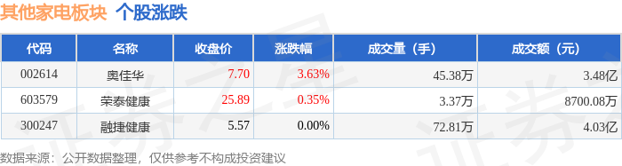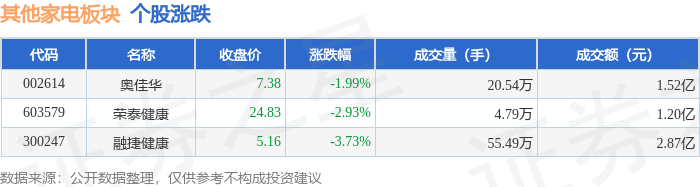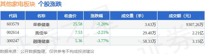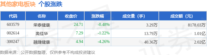 证券之星消息,11月21日其他家电板块较上一交易日下跌4.1%,融捷健康领跌。当日上证指数报收于 3834.89,下跌2.45%。深证成指报收于12538.07,下跌3.41%。其他家电板块个股涨跌见下表: 以上内容为证券之星据公开信息整理,由AI算法生成(网信算备310104345710301240019号),不构成投资建议。 | 代码 | 名称 | 收盘价 | 涨跌幅 | 成交量(手) | 成交额(元) | | | --- | --- | --- | --- | --- | --- | --- | | 002614 | 喫佳化 | 7.08 | -2.88% | 17.17万 | | 1.22亿 | | 603579 | 荣泰健康 | 23.85 | -3.48% | 4.53万 | | 1.10亿 | | 300247 | 融捷健康 | 4.65 | -5.87% | 41.96万 | | 266"I | | 代码 | | | 名称 主力净流入(元) 主力净占比 游资净流入(元) 游资净占比 散户净流入(元) 散户净占比 | | | | | --- | --- | --- | --- | --- | - ...