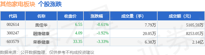 | 代码 | 名称 | 收盘价 | 涨跌幅 | 成交量(手) | 成交额(元) | | | --- | --- | --- | --- | --- | --- | --- | | 603579 | 荣泰健康 | 35.35 | 1.41% | 6.58万 | | 2.35 Z | | 300247 | 融捷健康 | 4.18 | 1.21% | 14.12万 | | 5879.45万 | | 002614 | 奥佳化 | 6.67 | 0.76% | 7.47万 | | 4951.96万 | 证券之星消息,9月29日其他家电板块较上一交易日上涨1.21%,荣泰健康领涨。当日上证指数报收于 3862.53,上涨0.9%。深证成指报收于13479.43,上涨2.05%。其他家电板块个股涨跌见下表: | 代码 | | | 名称 | | | | | --- | --- | --- | --- | --- | --- | --- | | 300247 融捷健康 | 385.17万 | 6.55% | 60.72万 | 1.03% | -445.89万 | -7.58% | | 002614 | -415.27万 | - ...