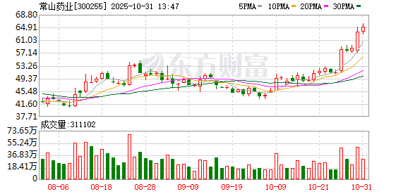 Core Viewpoint - Changshan Pharmaceutical's stock price increased by 2.63%, reaching a new high of 65.17 CNY per share, with a total market capitalization surpassing 59.895 billion CNY and a trading volume of 1.686 billion CNY [2] Group 1 - The stock price of Changshan Pharmaceutical has reached a new high [2] - The total market capitalization of the company has exceeded 59.895 billion CNY [2] - The trading volume for the day was 1.686 billion CNY [2]