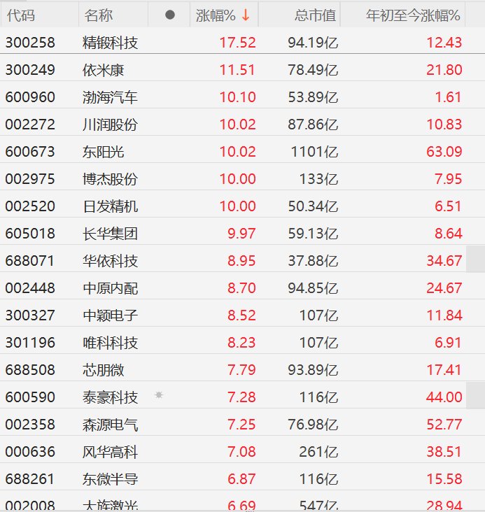 Group 1 - The A-share market saw a strong performance in robotics-related stocks, with notable gains in several companies [1] - Jingzhu Technology (精锻科技) increased by over 17%, while Yimikang (依米康) rose by over 11% [1] - Other companies such as Bohai Automotive (渤海汽车), Chuanrun Co. (川润股份), and Dongyangguang (东阳光) reached the daily limit of 10% increase [1] Group 2 - The following table summarizes the performance of key stocks in the robotics sector, including their percentage increase and market capitalization: - Jingzhu Technology (300258): +17.52%, Market Cap: 9.419 billion [2] - Yimikang (300249): +11.51%, Market Cap: 7.849 billion [2] - Bohai Automotive (600960): +10.10%, Market Cap: 5.389 billion [2] - Chuanrun Co. (002272): +10.02%, Market Cap: 8.786 billion [2] - Dongyangguang (600673): +10.02%, Market Cap: 110.1 billion [2] - Other notable stocks include Bojie Co. (博杰股份), Rifa Precision Machinery (日发精机), and Changhua Group (长华集团) with increases around 10% [2]