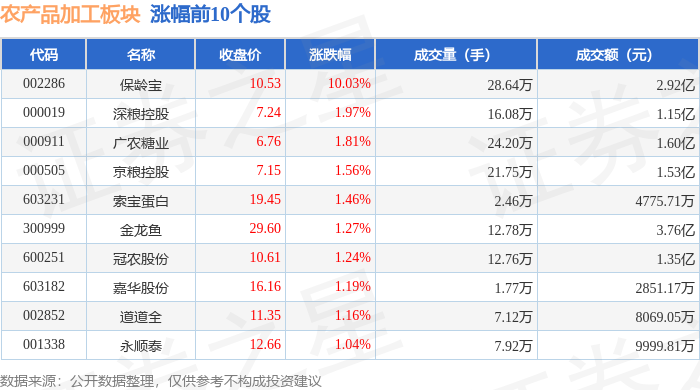 证券之星消息,2月3日农产品加工板块较上一交易日上涨0.44%,*ST佳沃领涨。当日上证指数报收于 4067.74,上涨1.29%。深证成指报收于14127.1,上涨2.19%。农产品加工板块个股涨跌见下表: | 代码 | 名称 | 收盘价 | 涨跌幅 | 成交量(手) | 成交额(元) | | --- | --- | --- | --- | --- | --- | | 000911 | 广农糖业 | 6.64 | -9.41% | 46.65万 | 3.09亿 | | 920273 | 一致魔宇 | 32.72 | -1.45% | 1.63万 | 5321.57万 | | 001338 | 永顺泰 | 12.53 | -1.34% | 12.40万 | 1.56亿 | | 002852 | 道道全 | 11.22 | -1.06% | 9.05万 | 1.02亿 | | 603231 | 索宝蛋白 | 19.17 | -1.03% | 3.64万 | 6978.55万 | | 920371 | 欧福蛋业 | 11.61 | -0.77% | 5.63万 | 6515.64万 | | 000972 | *S ...