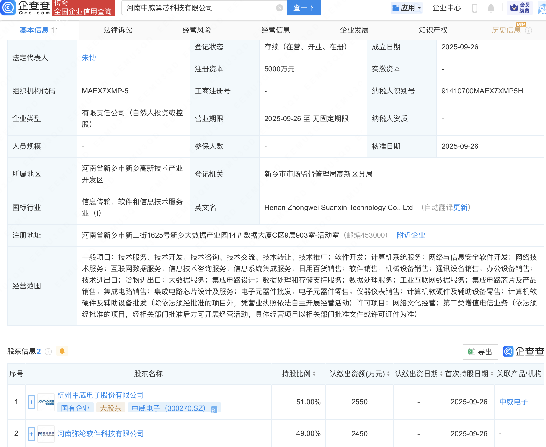 企查查APP显示,近日,河南中威算芯科技有限公司成立,注册资本5000万元,经营范围包含:工业互联网数据服务;集成电路芯片及产品销售;集成电路 销售;集成电路芯片设计及服务等。企查查股权穿透显示,该公司由中威电子(300270)等共同持股。 | 序号 | 股东名称 | 持股比例 ⇒ | | --- | --- | --- | | | 杭州中威电子股份有限公司 JOYWARE | 51.00% | | | 国有企业 大股东 中威电子(300270.SZ) 图 | | | 2 | 隆…… 河南弥纶软件科技有限公司 | 49.00% | | | 河南中威算芯科技有限公司 全国企业信用查询 | | × 查一下 | | --- | --- | --- | --- | | 基本信息 11 | 法律诉讼 | 经营风险 | 经营信息 | | 法定代表人 | 朱博 | 登记状态 | 存续(在营、开业、 | | | | 注册资本 | 5000万元 | | 组织机构代码 | MAEX7XMP-5 | 工商注册号 | | | 企业类型 | 有限责任公司(自然人投资或控 服) | 营业期限 | 2025-09-26 至 无固ス | | ...