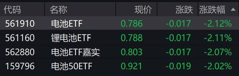 有分析认为,近年来,政策支持为电池行业发展注入了强劲动力。国家持续推出新能源汽车鼓励政策,包括以 旧换新、充电基础设施建设及新能源下乡等,进一步释放了消费潜力。同时,"反内卷"政策的逐步落地促使行 业竞争趋于理性,整体盈利环境有望改善。 受盘面影响,电池相关ETF跌超2%。 | 代码 | 名称 | 现价 | 涨跌 涨跌幅 ▲ | | --- | --- | --- | --- | | 561910 | 电池ETF | 0.786 | -0.017 -2.12% | | 561160 | 锂电池ETF | 0.788 | -0.017 -2.11% | | 562880 | 电池ETF嘉实 | 0.803 | -2.07% -0.017 | | 159796 | 电池50ETF | 0.921 | -0.019 -2.02% | 每经记者:叶峰 每经编辑:肖芮冬 电池概念股走低,阳光电源跌超4%,天赐材料跌超3%,宁德时代跌超2%。 每日经济新闻 ...