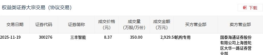 Core Insights - On November 19, Sanfeng Intelligent executed a block trade of 3.5 million shares, amounting to 29.295 million yuan, which represented 11.34% of the total trading volume for the day [1][2] - The transaction price was 8.37 yuan per share, reflecting a 7% discount compared to the market closing price of 9 yuan [1][2] Summary by Categories - **Transaction Details** - Date of transaction: November 19, 2025 [2] - Security code: 300276 [2] - Security name: Sanfeng Intelligent [2] - Transaction price: 8.37 yuan [2] - Volume traded: 3.5 million shares [2] - Total transaction amount: 29.295 million yuan [2] - Buyer: Institutional special account [2] - Seller: Guotai Junan Securities Co., Ltd. Shanghai Putuo District Dahua Road Securities Business Department [2]