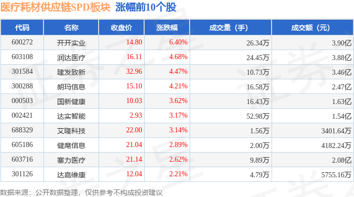 | 代码 | 名称 | 收盘价 | 涨跌幅 | 成交量(手) | 成交额(元) | | --- | --- | --- | --- | --- | --- | | 603122 | 合富中国 | 21.20 | -10.02% | 18.69万 | 3.97亿 | | 600511 | 国药股份 | 28.82 | -0.07% | 4.51万 | + 1.30亿 | | 000411 | 英特集团 | 11.07 | 0.00% | 4.99万 | 5560.70万 | | 000950 | 重药控股 | 5.17 | 0.19% | 0 22.18万 | 1.15亿 | | 300026 | 红日药业 | 3.61 | 0.56% | 36.77万 | 1.33亿 | | 603987 | 康德来 | 8.50 | 0.59% | 7.07万 | 6021.94万 | | 000028 | 国药一致 | 24.99 | 0.60% | 2.59万 | 6460.40万 | | 000705 | 浙江震元 | 9.37 | 0.64% | 9.34万 | 8837.43万 | | 002589 | 瑞康医药 ...
