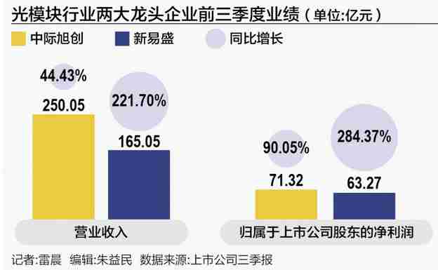 光模块双雄:高增长审美疲劳 高估值面临压力 10月30日,光模块行业两大龙头企业——中际旭创(300308.SZ)与新易盛(300502.SZ)相继披露2025年第 三季度财报。 尽管两家公司前三季度业绩均实现显著增长,市场却以一致的抛售作为回应。 10月31日,两家公司股价双双重挫,截至收盘,中际旭创跌8.11%,新易盛跌幅达7.94%。 在AI算力需求持续爆发的行业背景下,这份看似矛盾的市场反应背后,是投资者对光模块企业增长质 量、盈利可持续性以及估值的重新审视。 高速增长隐忧 中际旭创三季报显示,公司前三季度实现营业收入250.05亿元,同比增长44.43%;归属于上市公司股东 的净利润71.32亿元,同比增长90.05%。 单季度看,第三季度公司营收102.16亿元,单季度毛利率达到43%,合并净利润33.27亿元,环比提升 30.38%。 新易盛同样表现不俗,前三季度实现营业收入165.05亿元,同比增长221.70%;归属于上市公司股东的 净利润63.27亿元,同比增长284.37%。新易盛的营收增速显著高于中际旭创,展现出更强的增长势头。 高速增长的财务数据背后,市场正以股价重挫表达着对光模块企 ...