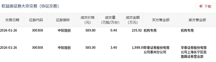 1月26日,中际旭创大宗交易成交3.8万股,成交额2224.92万元,占当日总成交额的0.15%,成交均价 585.51元,较市场收盘价589.8元折价0.73%,其中最高成交价589.8元,最低成交价585元。 | 权益类证券大宗交易(协议交易) | | | | | | 团 下载 | | --- | --- | --- | --- | --- | --- | --- | | 交易日期 | 证券代码 | 证券简称 | 成交价格 (元) | 成交量 (万股/万份) | 成交金额 买方营业部 (万元) | 卖方营业部 | | 2026-01-26 | 300308 | 中际旭创 | 589.80 | 0.40 | 235.92 机构专用 | 机构专用 | | 2026-01-26 | 300308 | 中际旭创 | 585.00 | 3.40 | 1,989.00华泰证券股份有限 | 华泰证券股份有限 | | | | | | | 公司泰州分公司 | 公司上海长宁区凯 SAN FLOR VINE AND BELL . I L. ANTI | ...