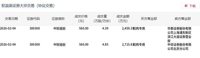 2月4日,中际旭创大宗交易成交9.24万股,成交额5175.18万元,占当日总成交额的0.18%,成交价560 元,较市场收盘价560元持平。 | 交易日期 | 证券代码 | 证券简称 | 成交价格 | 成交量 | 成交金额 | 买方营业部 | 卖方营业部 | | --- | --- | --- | --- | --- | --- | --- | --- | | | | | (元) | (万股/万份) | (万元) | | | | 2026-02-04 | 300308 | 中际旭创 | 560.00 | 4.39 | 2,459.3 轨构专用 | | 华泰证券股份有限 | | | | | | | | | 公司上海浦东新区 | | | | | | | | | 滨江大道证券营业 | | | | | | | | | 新 | | 2026-02-04 | 300308 | 中际旭创 | 560.00 | 4.85 | 2,715.8 机构专用 | | 中信证券股份有限 | | | | | | | | | 公司北京分公司 | ...