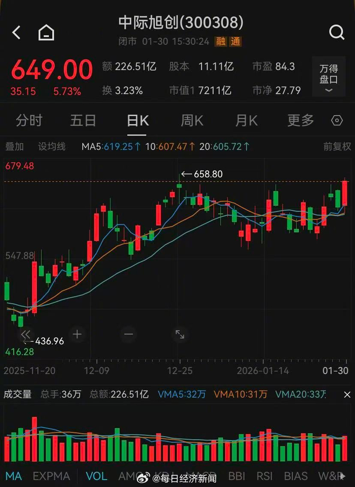 【#中际旭创预计2025年净利润超98亿#】1月30日,中际旭创公告称,预计2025年归属于上市公司股东 的净利润为98亿元至118亿元,比上年同期增长89.50%至128.17%。业绩变动原因:受益于终端客户算 力基础设施强劲投入,公司高速光模块出货快速增长,产品方案持续优化、运营效率提升,带动营收与 净利润大幅增长;同时受股份支付费用、存货及信用减值、汇兑损失等影响,部分抵减盈利增幅。(每 经,德塔) 中际旭创(300308) < C 闭市 01-30 15:30:24 融 通 额 226.51亿 股本 11.11亿 市盈 84.3 力得 盘口 换 3.23% 市值1 7211亿 市净 27.79 35.15 5.73% 分时 五日 日K 周K 月K 更多 (0) 叠加 设均线 MA5:619.25↑ 10:607.47↑ 20:605.72↑ 前复权 679.48 + 658.80 547.88 Z -436.96 416.28 promotion in the promotion in the promotion in the promotion in the many of the many of ...