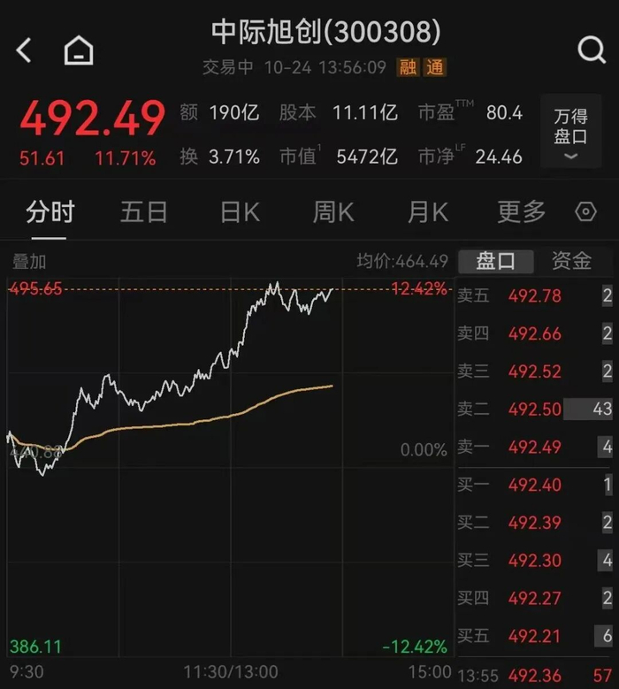10月24日午后,算力股持续走强,中际旭创大涨近12%,本周累计涨超30%,截至发稿,报492.49元/ 股,成交额为190亿元。 此外,方正科技一度涨停,现涨超9%;胜宏科技、景旺电子、新易盛、工业富联多股涨超5%。 ...