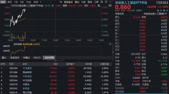 22日早盘,光模块三巨头"易中天"逆市表现,创业板人工智能表现一枝独秀!截至发稿,天孚通信领涨 超7%,中际旭创涨超3%刷新历史高点,新易盛、太辰光、长芯博创等多股跟涨超1%。 热门ETF方面,同类规模最大、流动性突出的创业板人工智能ETF(159363)场内逆市涨超1%日线三 连涨,成交额快速突破2.5亿元,资金盘中抢筹。 | 分制 多日 1分 5分 15分 30分 * | 创业板人工智能ETF华宝 | F9 盘前盘后 婴加 九转 图线 工具 (2 > | 159363 | 159363[创业板人工程能ETF华宝] 10:10 价 0.860 游呗 0.010(1.18%) 均价 0.852 品 ... | 0.860 | +0.010 +1.18% | 0.86 | | | | | | | | | | | | | | --- | --- | --- | --- | --- | --- | --- | --- | --- | --- | --- | --- | --- | --- | --- | --- | --- | --- | --- | --- | | W | 27 0 4 | SZSE CNY 10 ...