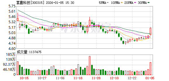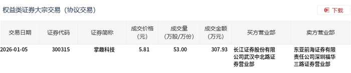 | 交易日期 | 证券代码 | 证券简称 | 成交价格 | 成交量 | 成交金额 (万元) | 买方营业部 | 卖方营业部 | | --- | --- | --- | --- | --- | --- | --- | --- | | | | | (元) | (万股/万份) | | | | | 2026-01-05 | 300315 | 掌趣科技 | 5.81 | 53.00 | | 307.93 长江证券股份有限 | 东亚前海证券有限 | | | | | | | | 公司武汉中北路证 | 责任公司深圳福华 | | | | | | | | 劳营业部 | 三路证券营业部 | 1月5日,掌趣科技大宗交易成交53万股,成交额307.93万元,占当日总成交额的0.53%,成交价5.81 元,较市场收盘价5.16元溢价12.6%。 ...