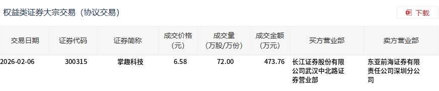 | 交易日期 | 证券代码 | 证券简称 | 成交价格 | 成交星 | 成交金额 | 买方营业部 | 卖方营业部 | | --- | --- | --- | --- | --- | --- | --- | --- | | | | | (元) | (万股/万份) | (万元) | | | | 2026-02-06 | 300315 | 掌趣科技 | 6.58 | 72.00 | | 473.76 长江证券股份有限 | 东亚前海证券有限 | | | | | | | | 公司武汉中北路证 | 责任公司深圳分公 | | | | | | | | 券营业部 | 글 | 2月6日,掌趣科技大宗交易成交72万股,成交额473.76万元,占当日总成交额的0.67%,成交价6.58元,较市场收盘价5.82元 溢价13.06%。 ...