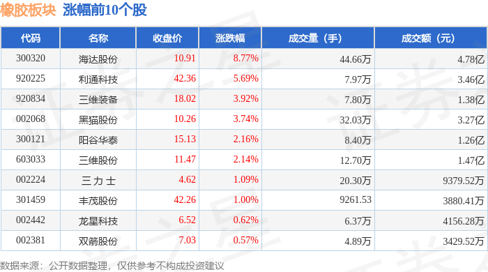 证券之星消息,11月10日橡胶板块较上一交易日上涨1.15%,海达股份领涨。当日上证指数报收于 4018.6,上涨0.53%。深证成指报收于13427.61,上涨0.18%。橡胶板块个股涨跌见下表: | 代码 | 名称 | 收盘价 | 涨跌幅 | 成交量(手) | 成交额(元) | | --- | --- | --- | --- | --- | --- | | 300320 | 海达股份 | 10.91 | 8.77% | 44.66万 | 4.78亿 | | 920225 | 利通科技 | 42.36 | 5.69% | 7.97万 | 3.46 Z | | 920834 | 三维装备 | 18.02 | 3.92% | 7.80万 | 1.38亿 | | 002068 | 黑猫股份 | 10.26 | 3.74% | 1 32.03万 | 3.27亿 | | 300121 | 阳谷华泰 | 15.13 | 2.16% | 8.40万 | 1.26亿 | | 603033 | 三维股份 | 11.47 | 2.14% | 12.70万 | 1.47亿 | | 002224 | 三力士 | 4.62 | 1. ...