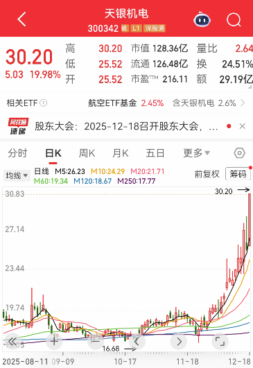 转自:证券时报 人民财讯12月18日电,12月18日早盘,商业航天概念股天银机电高开高走,并于10时左右封 住"20cm"的涨停板,最新股价30.2元/股,创下历史新高。今年前三季度,公司实现净利润0.24亿元,同 比下滑56.1%。 | | 天银机电 | | | | | | | --- | --- | --- | --- | --- | --- | --- | | | 300342 费 LT 深般通 | | | | | | | 30.20 | la | | 30.20 | 市值 128.36亿 | 量比 | 2.64 24.51% | | | 保 | | 25.52 | 流通 126.48亿 | 换 | | | 5.03 19.98% | | | 25.52 | 市盈™ 216.11 | 额 | 29.19亿 | | 相关ETF (2 | 航空ETF基金 2.45% 含天银机电 2.6% > | | | | | | | | 股东大会:2025-12-18召开股东大会 | | | | | | | 分时 | 日K | 周K | 月K | 五日 | 更多 v | | | 均线 | 日线 M5:26.23 M10: ...