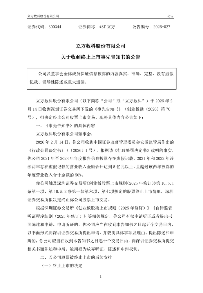 *ST立方:股票将于2026年2月24日(星期二)开市起停牌