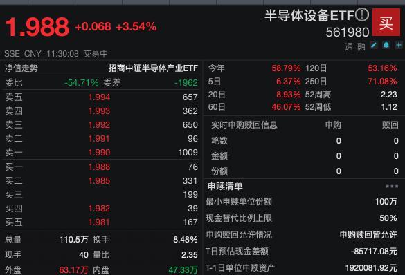 兴业证券也认为,2024年光刻先行,同时国产设备先进工艺突破与验证持续推进;未来3年, "先进工 艺扩产"或将成为自主可控主线。 半导体设备ETF(561980)跟踪中证半导,标的指数中"半导体设备+材料"含量约70%,前十大重仓中 微公司、北方华创、寒武纪-U、中芯国际、海光信息、长川科技等头部设备、材料、集成电路设计与 制造厂商,聚焦"卡脖子"攻坚领域。 10月24日,芯片、AI算力板块持续拉升。 截至午盘,"设备"双强北方华创、中微公司联袂走强,分别涨2.56%、4.96%,拓荆科技大涨5.10%,长 川科技、中科飞测涨超4%,中芯国际、海光信息、南大光电等涨超3%;中际旭创大涨6.60%,新易盛 涨超4%,中科曙光涨3.66%。 ETF方面,截至午盘,云计算ETF(159890)涨2.04%;半导体设备ETF(561980)涨3.54%,数据显 示近10个交易日内获资金净流入超3.4亿元。 | | 1 0 8 +0.068 +3.54% | | | 半导体设备ETF1 561980 | ਐੱ | | --- | --- | --- | --- | --- | --- | | | SSE CNY 11: ...