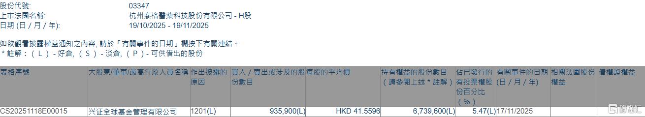 | 表格序號 | 大股東/董事/最高行政人員名稱 作出披露的 買入 / 賣出或涉及的股每股的平均價 | | | | | 持有權益的股份數目 佔已發行的 有關事件的日 | | | --- | --- | --- | --- | --- | --- | --- | --- | | | | | 份數目 | | | (請參閱上述*註解)有投票權股 (日 / 月 / 年) | | | | | | | | | 份百分比 | | | CS20251118E00015 | 兴证全球基金管理有限公司 | 1201(L) | | 935,900(L | HKD 41.5596 | 6.739.600(L) | 5.47(L)17/11/2025 | 泰格医药(3347.HK)今日盘中一度跌3.57%至39.44港元,股价创7月9日以来逾4个月新低。该股自上周五(11月14日)迄今已连续4个交易日下跌,累跌12.94%。 消息面上,联交所最新权益披露资料显示,泰格医药于11月17日遭兴证全球基金管理有限公司在场内以每股均价41.5596港元减持93.59万股,涉资约3889.56 万港元。减持后,其最新持股数目为673.96万股, ...