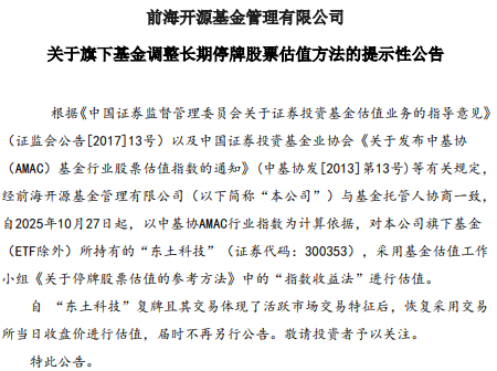 Core Viewpoint - The announcement from Qianhai Kaiyuan Fund Management Co., Ltd. indicates a change in the valuation method for long-term suspended stocks held by its funds, specifically for "Dongtu Technology" (stock code: 300353) starting from October 27, 2025 [1] Group 1 - The valuation for "Dongtu Technology" will be based on the AMAC industry index using the "index return method" as per the guidelines from the fund valuation working group [1] - Once "Dongtu Technology" resumes trading and demonstrates active market trading characteristics, the valuation will revert to using the closing price on the trading day, with no further announcements required [1]
