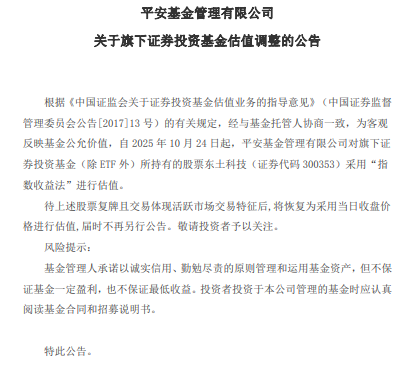 Group 1 - The core point of the announcement is that Ping An Fund Management Co., Ltd. will adjust the valuation method for its securities investment funds, specifically for the stock Dongtu Technology (stock code 300353) [1] - Starting from October 24, 2025, the valuation of Dongtu Technology will be based on the "index income method" instead of the previous method [1] - The valuation method will revert to using the closing price on the day of trading once the stock resumes trading and exhibits active market trading characteristics, without further announcements [1]