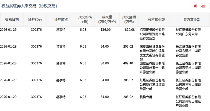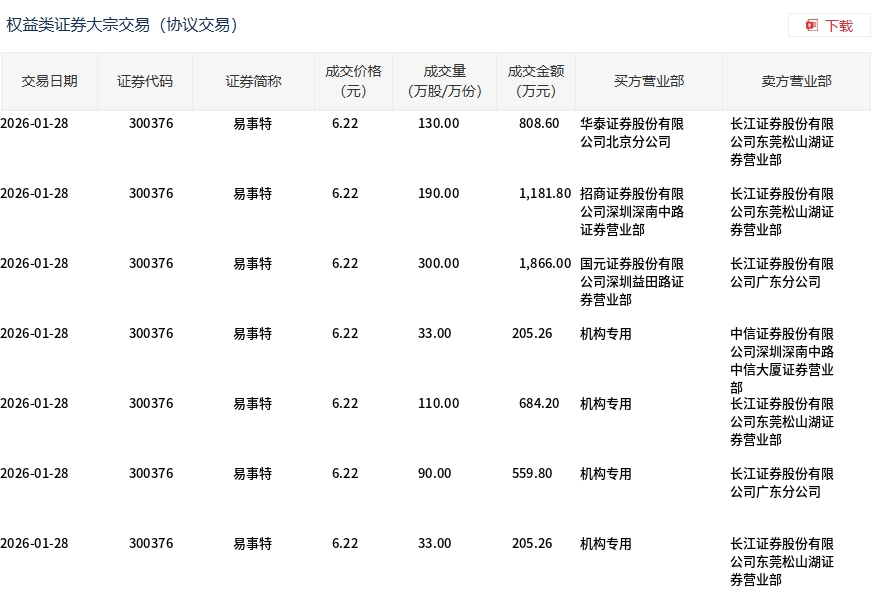 1月28日,易事特(维权)大宗交易成交886万股,成交额5510.92万元,占当日总成交额的8.79%,成交价6.22元,较市场收 盘价6.87元折价9.46%。 | 交易日期 | 证券代码 | 证券简称 | 成交价格 | 成交量 | 成交全额 | 买方营 部 | 卖方营业部 | | --- | --- | --- | --- | --- | --- | --- | --- | | | | | (元) | (万股/万份) | (万元) | | | | 2026-01-28 | 300376 | 易事特 | 6.22 | 130.00 | 808.60 | 华泰证券股份有限 | 长江证券股份有限 | | | | | | | | 公司北京分公司 | 公司东莞松山湖证 | | | | | | | | | 券营业部 | | 2026-01-28 | 300376 | 易事特 | 6.22 | 190.00 | | 1,181.80 招商证券股份有限 | 长江证券股份有限 | | | | | | | | 公司深圳深南中路 | 公司东莞松山湖证 | | | | | | | | 证券营业部 | 券营业部 | | 2026- ...